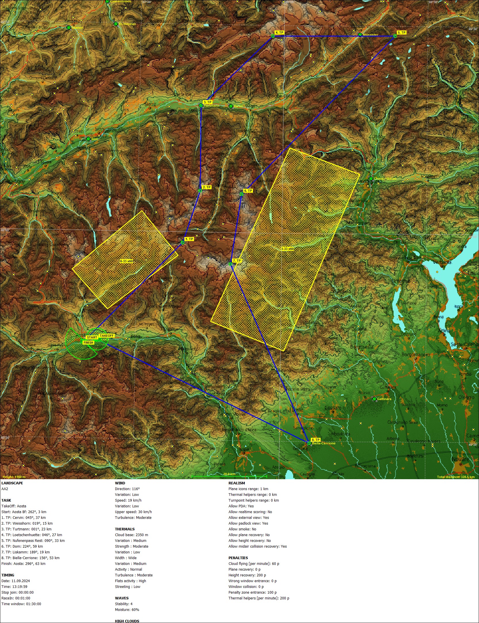 Высота старта 2800 м. Финиш 700 м. Ветер 20 км/ч. Умеренная термическая активность. Широкие потоки. Средняя болтанка.