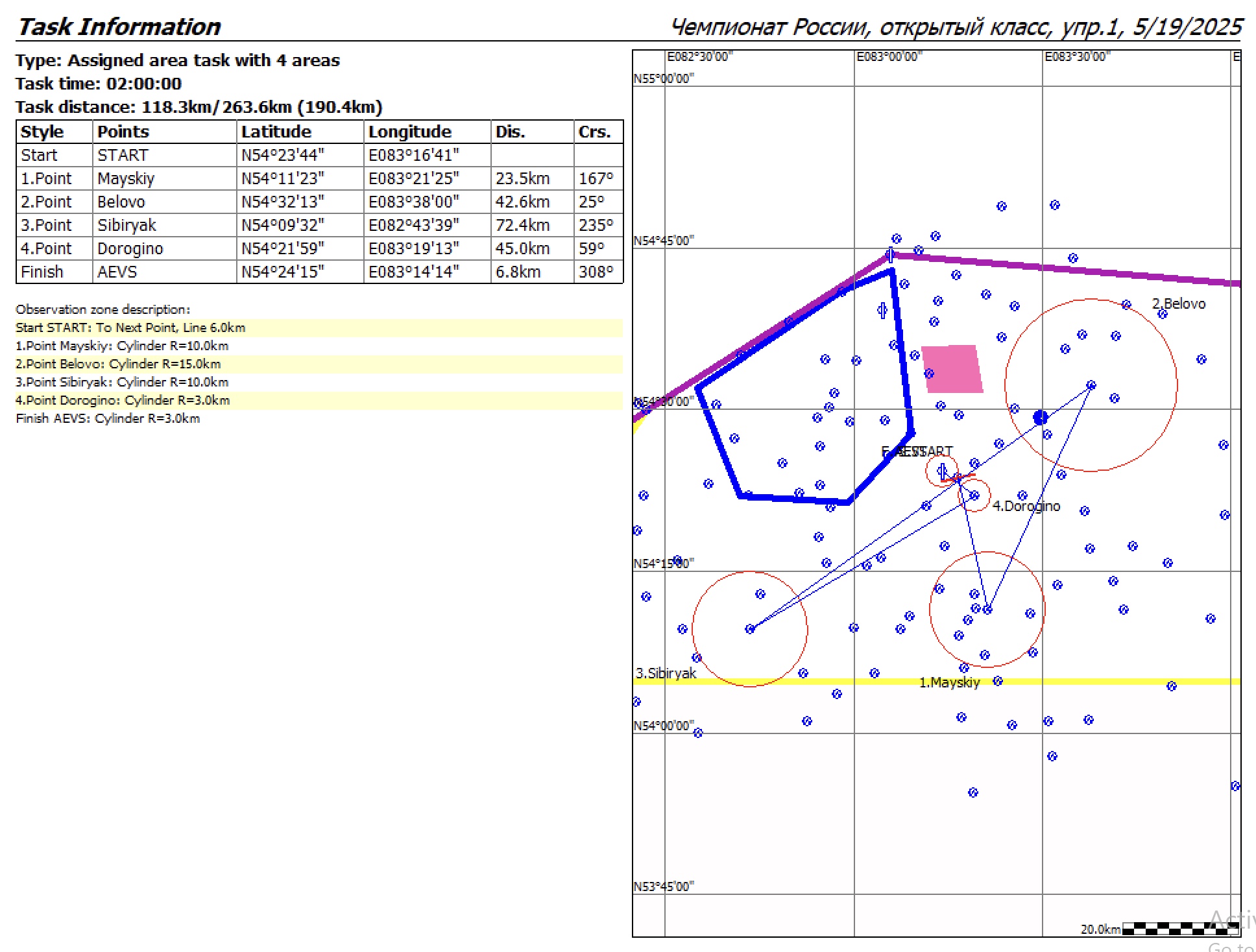 1.Точка: Mayskiy (R=10 км, D=23,45 км)